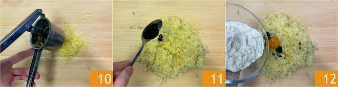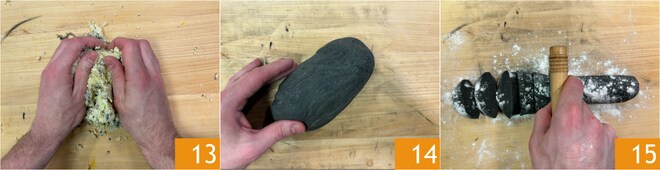 Mientras tanto, en una tabla de amasar, aplastad las patatas 10, añadid la tinta de sepia 11, una yema y la harina 12.