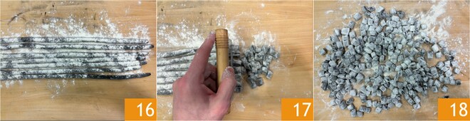 Con cada una de estas porciones formad cilindros de unos 2 cm de grosor 16. Enharinadlos bien para que no se peguen entre sí, luego cortadlos en trozos con una rasqueta 17 para formar los ñoquis 18.