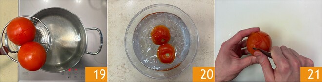 Después de lavar los tomates, realizad un corte en forma de cruz en la parte inferior y escaldadlos durante 2 minutos 19. Sumergidlos luego en agua con hielo durante otros 2 minutos 20 y eliminad la piel 21, que ahora se desprenderá fácilmente.