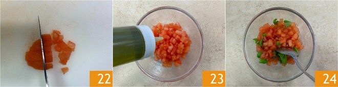 Cortad los tomates por la mitad, eliminad las semillas, luego cortadlos en cubos 22. Condimentad con aceite 23, sal, pimienta y albahaca fresca. Mezclad bien 24.