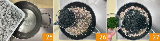 Sumergid los ñoquis en agua hirviendo con sal 25 y cocinadlos hasta que floten. Eliminad el ajo del ragú de sepias, luego escurrid los ñoquis y transferidlos a la sartén 26, añadid el perejil fresco picado 27 y mezclad, a fuego apagado, para que se impregnen de sabor.