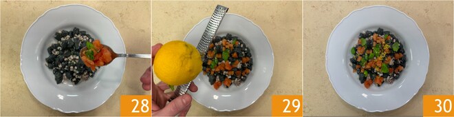 Emplatad los ñoquis y completad con los cubos de tomate 28, una cucharada de fondo de cocción de las sepias, hojas de albahaca y cáscara de limón rallada 29. ¡Los ñoquis al nero di seppia con ragú de sepias están listos para ser servidos 30!
