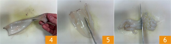 Eliminad la piel 4 y cortad el cuerpo y los tentáculos en cubos pequeños 5 6.