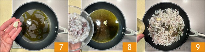 En una sartén verted un hilo de aceite y añadid el ajo machacado 7, luego rehogad durante unos minutos. Incorporad las sepias cortadas 8 y cocinad durante 5 minutos, a fuego medio. Desglasad con vino blanco 9 y cocinad durante 20 minutos, añadiendo un poco de agua si es necesario.