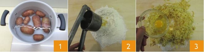 Para preparar los ñoquis al gorgonzola, comienza hirviendo las patatas: coloca las patatas en una olla grande y cúbrelas con abundante agua fría 1. Desde el momento en que el agua hierva, cuenta unos 30-40 minutos, dependiendo del tamaño de las patatas; haz la prueba del tenedor y si las púas entran sin dificultad en el centro, entonces podrás escurrirlas. Pélalas aún calientes y tritúralas sobre la harina que habrás esparcido sobre la tabla de trabajo 2. Añade el huevo ligeramente batido junto con una pizca de sal 3.