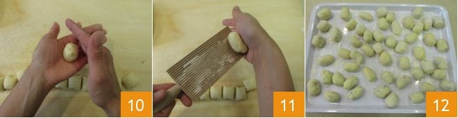 Rueda el bocadito delicadamente entre las manos como una albóndiga para darle una forma redondeada 10, añade un poco de harina si la masa está pegajosa. Finalmente pasa los ñoquis uno a uno por el rallador de ñoquis 11 que les dará la clásica estría que caracteriza esta pasta. Coloca los ñoquis bien separados entre ellos sobre una bandeja enharinada 12. Mientras tanto, pon al fuego una cacerola llena de agua para salar al hervir, para la cocción de los ñoquis.