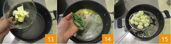 Prepara el condimento: pon la mantequilla en una cacerola 13 y derrítela con algunas hojas de salvia 14. Cocina los ñoquis en abundante agua salada 15.