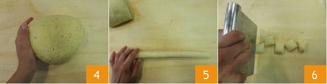 Amasa todo con las manos hasta obtener una masa suave pero compacta 4. Recuerda que si los trabajas demasiado, los ñoquis se volverán duros durante la cocción, así que limítate a amasar lo necesario. Saca de la masa unos choricillos de un diámetro de unos 3 cm 5, con la ayuda de una espátula cortadora saca bocaditos de 2 cm de espesor 6.