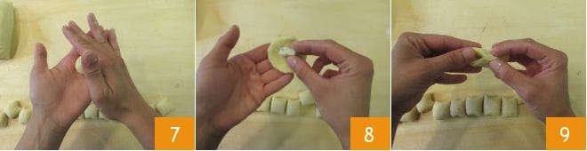 Aplasta con los dedos los bocaditos para obtener pequeños círculos de masa 7. Coloca en el centro del círculo un pequeño cubito de gorgonzola 8, luego cierra la masa 9.