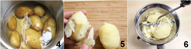 Mientras tanto, prepara los ñoquis. Lava las patatas y ponlas a cocer con la piel en una olla con agua salada 4, cuando estén cocidas, escúrrelas y, aún calientes, quítales la piel 5. Cháfalas con la ayuda de un pasapurés o un prensapatatas y ponlas en un bol grande 6,