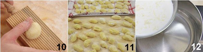 luego comienza a formar tus ñoquis con la ayuda del utensilio para ñoquis 10, finalmente colócalos sobre una superficie o bandeja enharinada antes de cocerlos 11. En este punto, toma el Asiago con la leche y ponlo en un cazo, luego llévalo a ebullición 12.