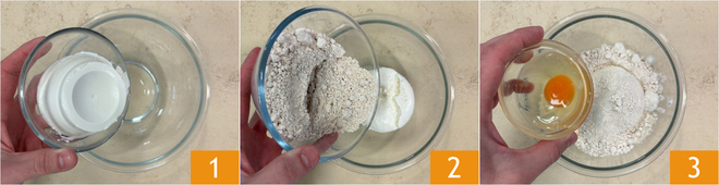 Para preparar los gnocchi de castañas sin gluten, primero poned la ricotta en un bol 1, luego añadid la harina de castañas 2 y el huevo 3.