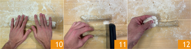 Moldead la masa para formar rollos 10, luego divididlos en piezas más pequeñas 11 y enharinarlos ligeramente 12.