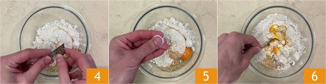 Sazonad con la nuez moscada 4 y la sal 5, luego mezclad los ingredientes con una cuchara 6.