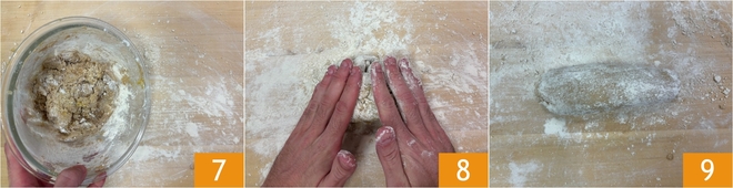 Transferid la mezcla a la superficie de trabajo enharinada 7 y continuad trabajando con las manos 8 hasta obtener una masa suave, homogénea y ligeramente pegajosa 9.