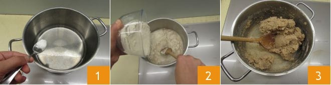 Para preparar los gnocchi de espelta con crema de Grana Padano, comenzad con la masa. En una olla, verted el agua, añadid la sal 1 y llevad a ebullición. Cuando esté hirviendo, echad la harina de un golpe y mezclad de inmediato con una cuchara de madera 2. Continuad removiendo durante 3 - 4 minutos hasta que la masa esté lo suficientemente seca y se haya formado una película alrededor de las paredes y en el fondo de la olla 3.
