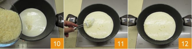 Dedicaos a la preparación de la crema de Grana Padano DOP: verted el queso rallado en un cazo junto con la nata calentada suavemente 10. Remover continuamente 11 hasta que el queso se haya derretido 12.