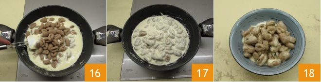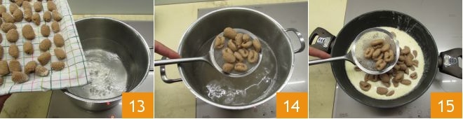 Mientras preparáis la crema, también podéis cocer los gnocchi. Echadlos en una olla con agua hirviendo y salada 13. Tan pronto como floten, escurridlos 14 y echadlos en el condimento 15.