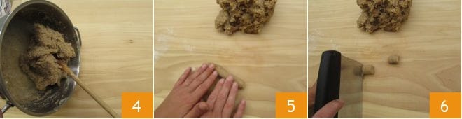 Transferid la mezcla a una superficie de trabajo 4 y dejad que se temple justo el tiempo necesario para que no os queméis. De hecho, la masa debe trabajarse aún caliente. Romped una porción de masa y formad cilindros con los dedos 5. Luego, cortad en trozos de un par de cm usando un cortador o una hoja lisa 6.