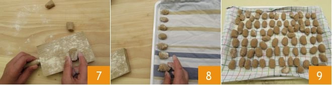 Espolvoread la tablilla de gnocchi con un poco de harina integral y pasad los trozos obteniendo así los gnocchetti surcados 7. A medida que los obtengáis, disponedlos sobre un paño colocado sobre una bandeja 8. Continuad así hasta agotar la masa y dejadlos momentáneamente aparte 9.