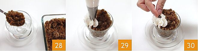Removed una última vez el granizado, teniendo en cuenta que cuanto más romped los cristales, más finos se volverán. Ahora componed el granizado: con una cuchara, verted el granizado de café en un vaso pequeño o una copa 13, decorad con un poco de nata montada 14 y un grano de café 15. ¡Vuestro granizado de café está listo para ser servido y acompañado de las mini madeleines!