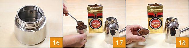 Para preparar el granizado de café, comenzad haciendo el café. Para obtener un buen café, llenad la caldera de vuestra cafetera con agua fría y preferiblemente baja en cal 1, teniendo cuidado de no superar la válvula de seguridad (de lo contrario, obtendréis un café más largo). Llenad el filtro con el café molido formando un montículo que nivelaréis golpeando el filtro sobre la mesa con movimientos decididos 2. No presionéis con la cucharilla ni hagáis agujeros en la superficie 3.