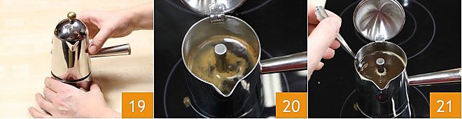 Cerrad la cafetera muy bien 4, para que el café no salga por los lados mientras sube, y ponedla a fuego bajo y constante para obtener un café con cuerpo. A medida que el café sube, se formará una espuma densa 5: os recomendamos no dejar hervir demasiado tiempo el café para mantener intacta su dulzura y aroma. Vuestro café está listo: antes de utilizarlo, mezcladlo directamente en la moka con una cucharilla para hacer el café más homogéneo 6.