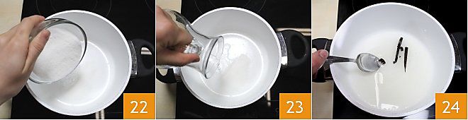 Ahora ocupáos de la realización del granizado: en un cazo antiadherente verted el azúcar 7 y añadid el agua 8. Después de cortar por la mitad una vaina de vainilla, vaciadla y unidla al agua y al azúcar con sus semillas 9 y llevad a ebullición.