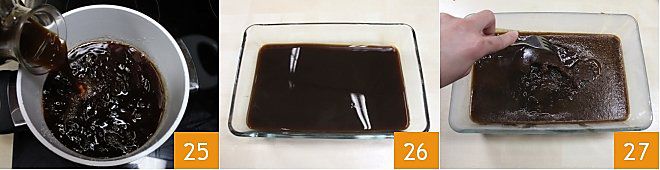 Unid luego el café recién preparado 10 y transferid la mezcla a un recipiente bajo y ancho 11 para acelerar la congelación. Dejadlo enfriar, extraed la vaina de vainilla y cubrid el recipiente con una capa de film transparente. Ponedlo en el congelador durante al menos 15-20 minutos. Cuando la mezcla se haya solidificado, romped los cristales de hielo con los dientes de un tenedor o con una batidora cada 10-15 minutos, repitiendo la operación 2-3 veces 12. Cada vez el tiempo disminuirá, porque la preparación ya está fría y por lo tanto tardará menos tiempo en solidificarse. Esta operación debe llevarse a cabo con delicadeza para no alterar el color del granizado. De hecho, si se incorpora demasiada aire, corre el riesgo de volverse beige y ya no marrón oscuro. Mientras tanto, montad la nata fresca líquida y el azúcar glas con una batidora eléctrica para guarnecer el granizado.