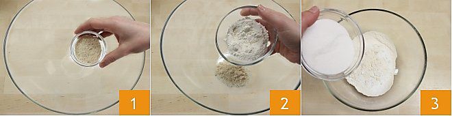 Para preparar las mini madeleines, comenzad poniendo en un bol la harina de almendra 1. Agregad la harina 00 tamizada 2 y el azúcar 3.