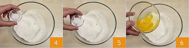Unid también la sal 4, la levadura tamizada 5 y los huevos 6.
