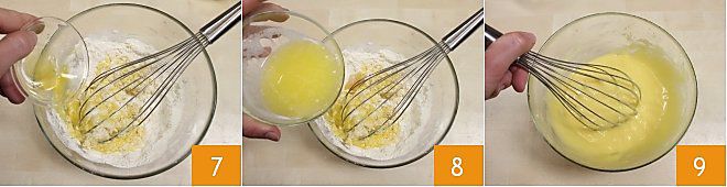 Continuad añadiendo la miel 7 y la mantequilla derretida previamente 8, luego mezclad bien con una batidora de mano 9.
