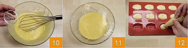 Por último, añadid el aroma de almendra 10. Cubrid la masa con film transparente y dejad reposar en el frigorífico al menos dos horas o, si podéis, toda la noche 11. Verted la mezcla en una manga pastelera y luego tomad un molde para mini madeleines de silicona, con las clásicas formas de concha, luego llenad todas las formas 12. Si no tenéis el molde de silicona, también podéis usar un molde de metal y verter la masa con una cucharilla.