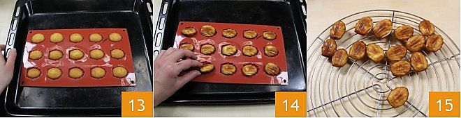 Transferid el molde a una bandeja de horno y hornead en horno estático a 190° durante unos 12 minutos, si usáis un horno ventilado, cocinad a 170° durante 6-7 minutos 13; si usáis un molde de metal, hornead a 180° hasta que estén doradas. Cuando se hayan templado, desmoldadlas delicadamente 14 y dejadlas enfriar sobre una rejilla 15. Conservadlas bajo una campana de vidrio o en un recipiente para que mantengan su fragancia.