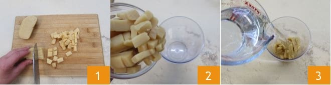 Para preparar el granizado de almendra, comienza cortando la pasta de almendra en pequeños cubos del mismo tamaño 1. Colócalos en un recipiente alto 2 y añade el agua 3.