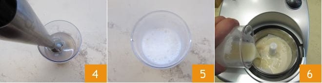 Batir los ingredientes con una batidora de inmersión 4 hasta obtener una crema 5. Vierte la mezcla en la heladera (sigue las instrucciones de tu heladera: para la que utilizamos no es necesario enfriar el recipiente en el refrigerador) 6.