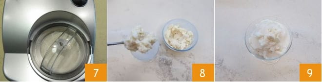 Deja que la heladera funcione durante al menos 30 minutos 7. Después de este tiempo obtendrás una mezcla de consistencia cremosa y compacta. Luego, transfiere el granizado a vasos preferiblemente helados para que no se derrita rápidamente 8 y sirve el granizado de almendra para una merienda fresca 9.