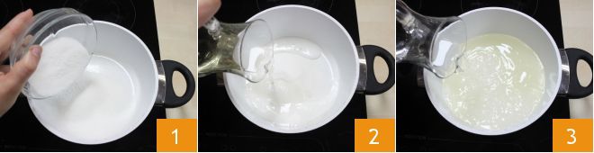 Para preparar el granizado Bellini, empieza con el jarabe: coloca el azúcar en un cazo 1, vierte el Prosecco 2 y añade el agua 3. Deja que el azúcar se disuelva y casi llegue a hervir. Luego apaga el fuego y deja enfriar el jarabe.