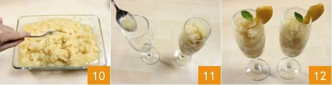 Repite la operación tres veces más: vuelve a poner el granizado en el congelador y cada 30 minutos sácalo para mezclarlo con un tenedor hasta obtener la consistencia del granizado 10. En este punto, vierte el granizado en las copas de flauta 11, decora con algunas hojitas de menta y adorna el vaso con rodajas de melocotón 12, ¡tu granizado Bellini está listo para saborear!