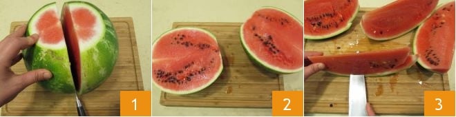 Para preparar el granizado de sandía, fresitas del bosque y vodka, primero coge la sandía: con un cuchillo haz un corte 1 hasta partirla en dos 2, luego córtala en rodajas 3 y posteriormente redúcela en pequeños trozos.