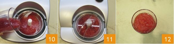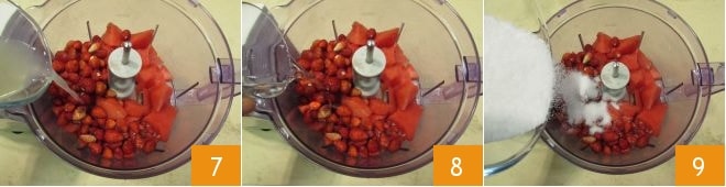 Vierte el jugo de limón junto con la sandía y el limón 7, luego añade la vodka 8, el azúcar 9 y mezcla todo hasta obtener una consistencia bastante fluida.