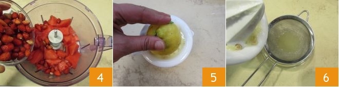 En una batidora, añade la sandía cortada en trozos y las fresitas del bosque 4, después exprime el limón 5 y cuela el jugo usando un colador 6.
