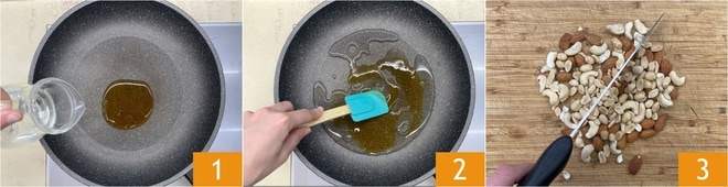 Para preparar la granola en sartén, primero vierte la miel y el agua en una sartén antiadherente 1, enciende el fuego y mezcla a fuego medio-bajo hasta que empiece a hervir 2. Mientras tanto, pica groseramente los cacahuetes, las almendras y los anacardos 3.