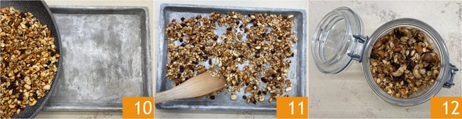 Transfiere la mezcla a una bandeja de aluminio 10 y distribúyela uniformemente para que se enfríe rápidamente 11. Una vez fría, la granola está lista para ser utilizada o almacenada 12.