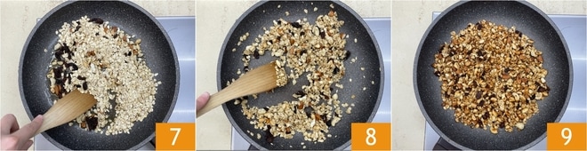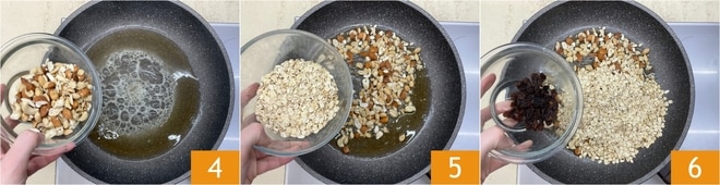Cuando el jarabe comience a hacer las primeras burbujas, sube el fuego y añade los frutos secos 4, luego incorpora la avena 5 y las pasas 6.