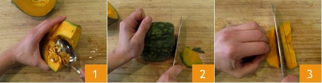 Para preparar los granos de harina de legumbres con salchicha y calabaza a la cerveza, comienza con la calabaza: quítale las semillas 1 y la piel externa 2. Luego corta la pulpa en rodajas de aproximadamente 1 cm 3