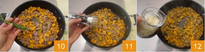 Condimenta con el romero 10, ajusta de sal y pimienta 11, luego rocía con la cerveza roja 12 y espera a que se evapore el alcohol,