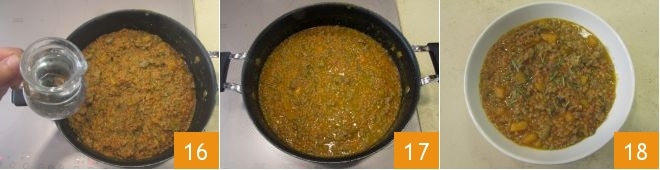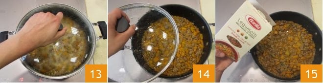 reduce el fuego y cuece con la tapa durante unos 10 minutos 13. Una vez que la calabaza esté suficientemente tierna, quita la tapa 14, añade los granos de harina de legumbres 15,
