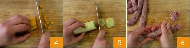 luego en cubitos 4. Corta la parte verde del puerro y la barbilla, y luego pélalo y córtalo en rodajas 5. Luego toma la salchicha y elimina la tripa; redúcela en trozos gruesos 6,
