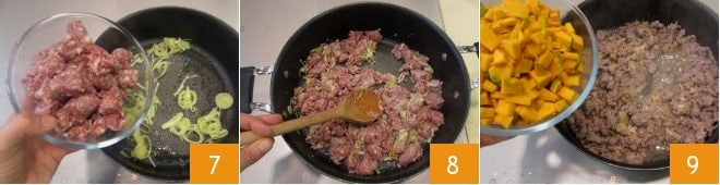 en una sartén dora el puerro con un chorrito de aceite ya caliente. Remueve a menudo para que no se pegue al fondo o se queme. Una vez esté tierno, añade la salchicha 7, mezcla y añade la calabaza 9 y sigue dorando, removiendo, a fuego medio hasta que la salchicha comience a dorarse.